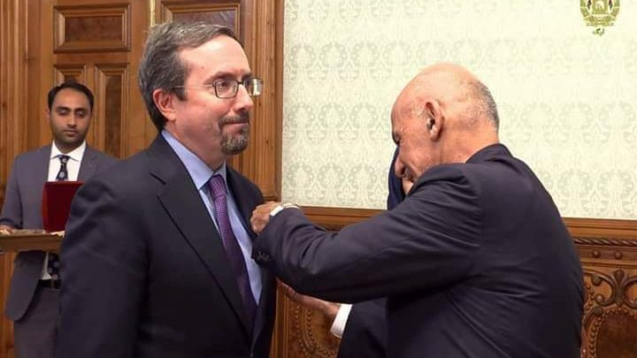 ولسمشر غني تېره شپه په کابل کې د امریکا سفیر ته چې د دندې موده یې پوره شوې ده، د رخصتۍ د مېلمستیا تر څنګ د غازي وزیر اکبرخان مډال ورکړ.